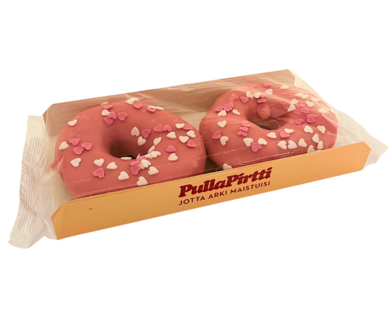 Hempeän vaaleanpunainen kuorrutemunkki sokerisydämillä koristeltuna. Hurmaa ystäväsi ta herkuttele ihan itse!