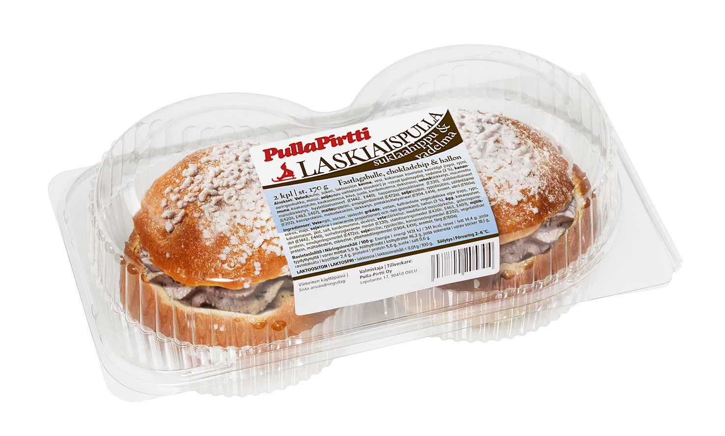 VEHNÄjauho, vesi, sokeri, vadelmahillo [10%, sokeri, vadelma (32%), vesi, vadelmatäysmehu (tiivisteestä), muunnettu perunatärkkelys (E1442), sakeuttamisaine (E440), happamuudensäätöaine (E330), säilöntäaine (E202)], KERMA, kasviöljy (rypsi, rapsi, palmu), vapaan kanan KANANMUNA, kokonaan kovetettu kasviöljy ja -rasva (palmuydin, auringonkukka, rypsi), suklaahile [2%, sokeri, kaakaomassa, vähärasvainen kaakaojauhe, emulgointiaine (E322 rapsilesitiini), pintakäsittelyaine (E904, E414)], hiiva, suola, kaakaojauhe, kardemumma, VEHNÄgluteeni, muunnettu maissitärkkelys (E1422), maissitärkkelys, stabilointiaine (E420ii, E463), MAITOproteiini, emulgointiaine (E472e, E322 auringonkukkalesitiini), aromit, väri (E160a), kasviproteiini, dekstroosi, entsyymi (VEHNÄ), jauhonparanne (E300), OHRAmallas.