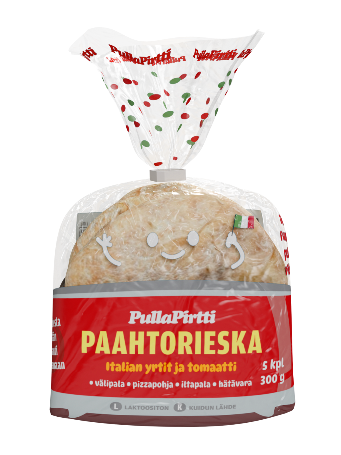 VEHNÄjauho, vesi, tomaattimurska (5%, tomaatti, tomaattimehu), kasviöljy (rypsi, kokonaan kovetettu rypsi), inverttisokerisiirappi, nostatusaine (E450, E500), hiiva, fermentoitu VEHNÄjauho, suola, sakeuttamisaine (E412), mausteseos (oregano, dekstroosi, basilika, sipulijauhe, kirveli, jodioitu suola, valkosipuli, paprika, mustapippuri), säilöntäaine (E200), perunatärkkelys, aromi.