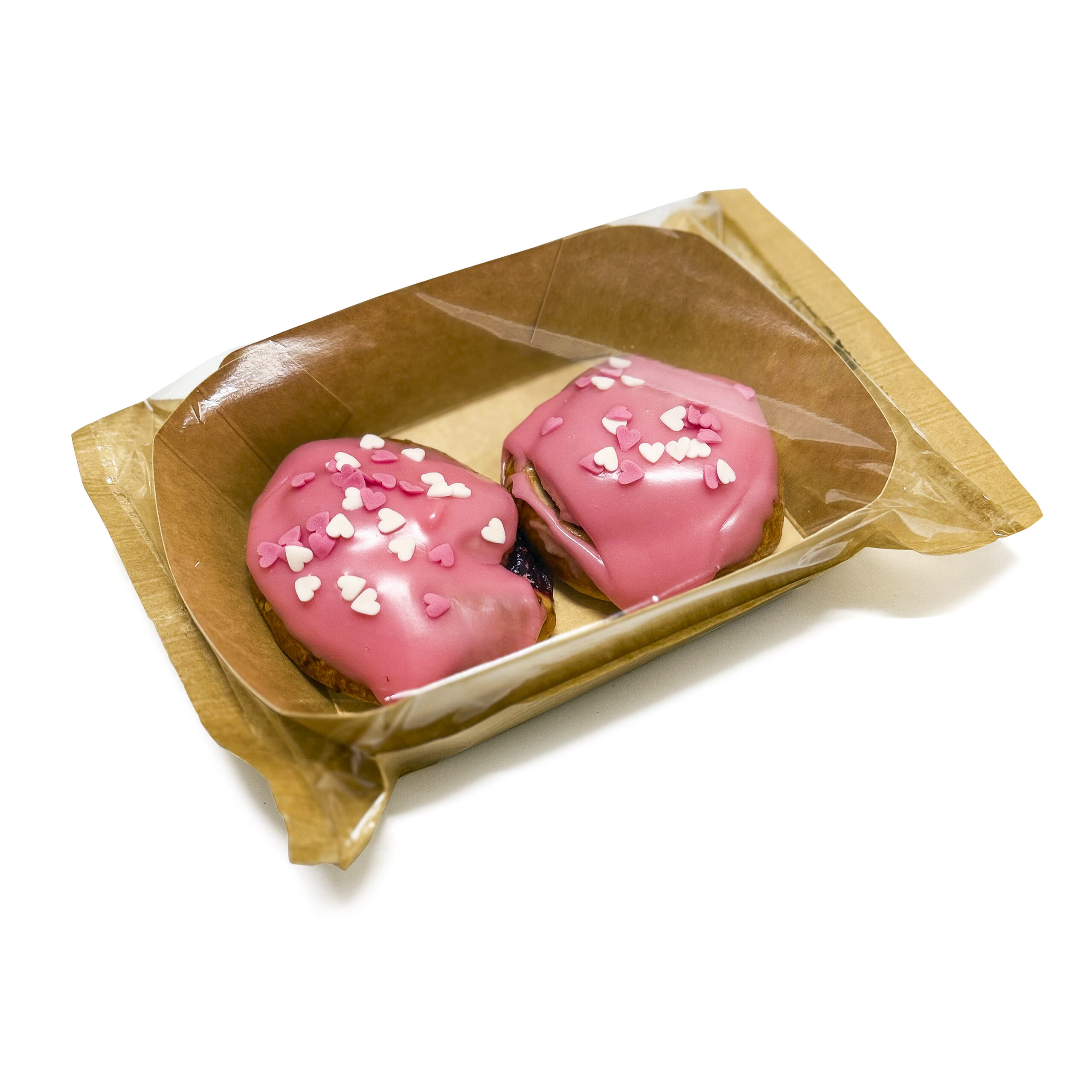 Vaaleanpunaisen herkullinen vadelmatäytteinen pulla sokerisydämillä koristeltuna.